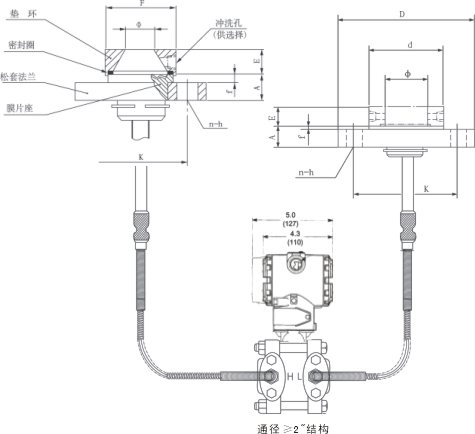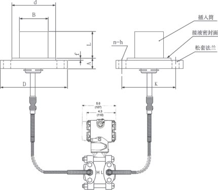 AK-3051DP雙法蘭液位變送器是一種通過安裝在管道或容器上的遠傳裝置來感受被測壓力,該壓力經毛細管內的灌充硅油(或其它的液體)傳遞至變送器的主體,然后由變送器主體內的δ室和放大線路板,將壓力或差壓轉換4~20mA.DC信號輸出(參見結構原理圖)。