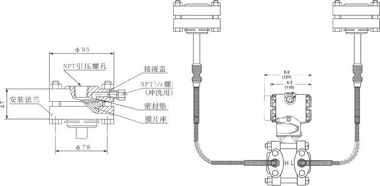 ⑤ DP型雙法蘭液位變送器兩側的毛細管zui大長度為7.5米,兩側長度差為4.5米。